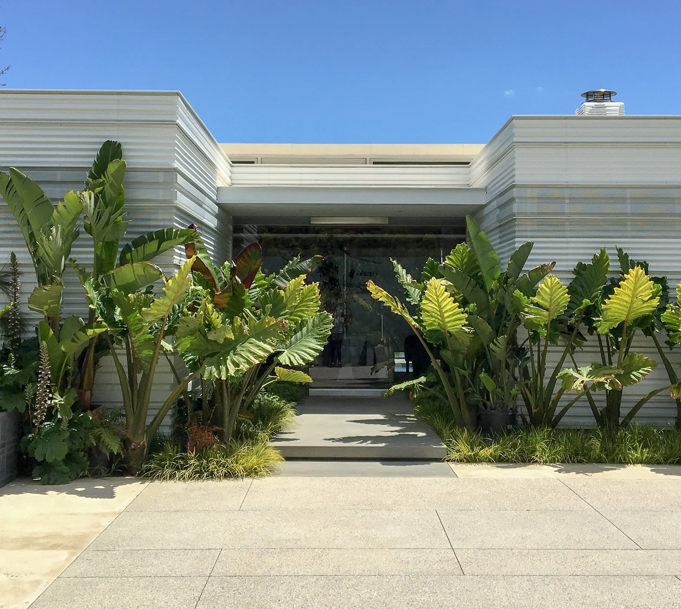Upon entry to the residence, a full height glass wall along the rear facade reveals the majestic views of Beverly Hills with a loggia that extends from the interior living space into the garden of ornamental grasses, agaves and clean hedge lines.